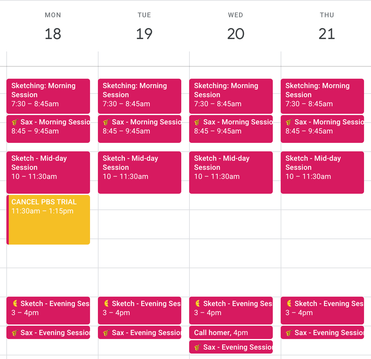 Similarly, I didn’t realize how much I relied on my work calendar to block off my time from others at work. Within the bounds of my job, I could spin up a calendar event to carve away focus time for myself or just time for lunch. Now that my calendar isn’t visible to those around me, I’ve got to make sure my schedule is clearly communicated to my partner and the other people that populate my day.